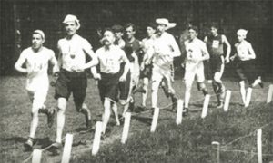 At the front with number 14, the Swede Ernst Fast leads the field on the oval in the Boulognerskogen.