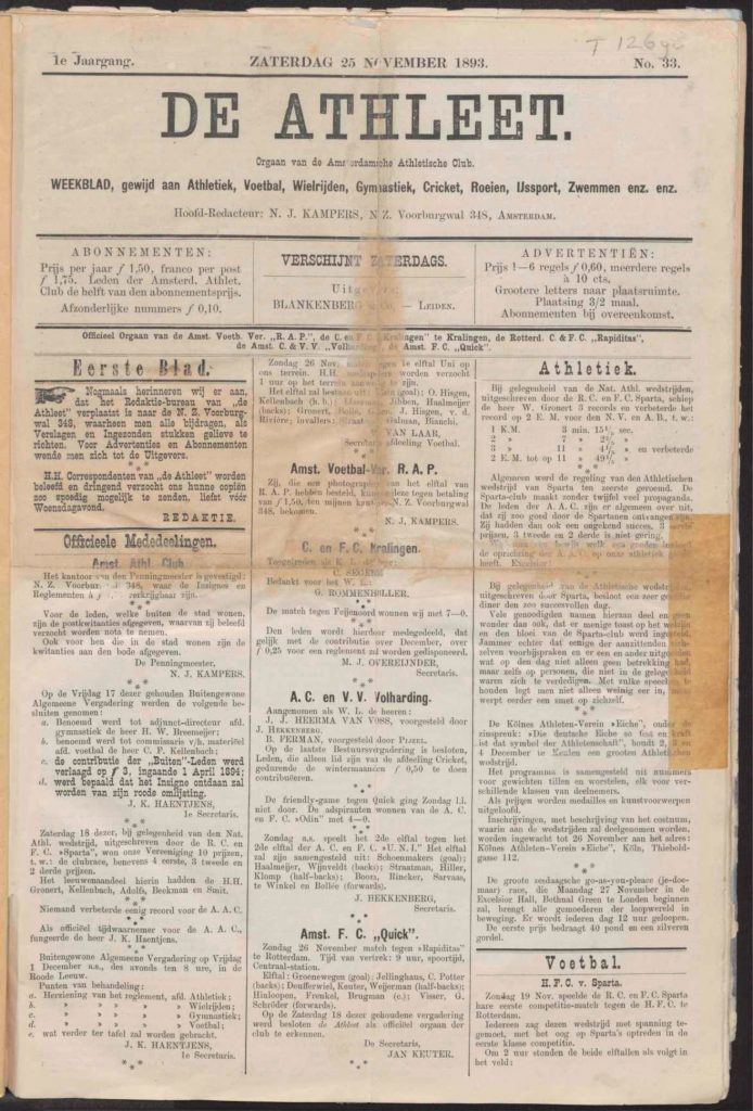 The oldest sporting publication available via Delpher is De Athleet, first published in 1893 and the official publication of the Amsterdam Athletic Club. Not just confined to athletics, the paper covered, as it said on its title page, ‘Athletics, Football, Cycling, Gymnastics, Cricket, Rowing, Ice-sports, Swimming etc. etc.’ However, as with other sporting publications, the official nature of the reports was emphasised by a series of official communications from a variety of clubs on the front page. November 25th edition was no exception. The usual official communiqués were followed by details about entering athletics competitions from Cologne to Bethnal Green, a series of football match reports, a piece on the first ‘national’ athletics match organised by Sparta of Rotterdam, and missives from the cycling, skating and hockey worlds. This was a publication for those who wanted to take part in sport, for members, not just for those with a casual interest. (link)