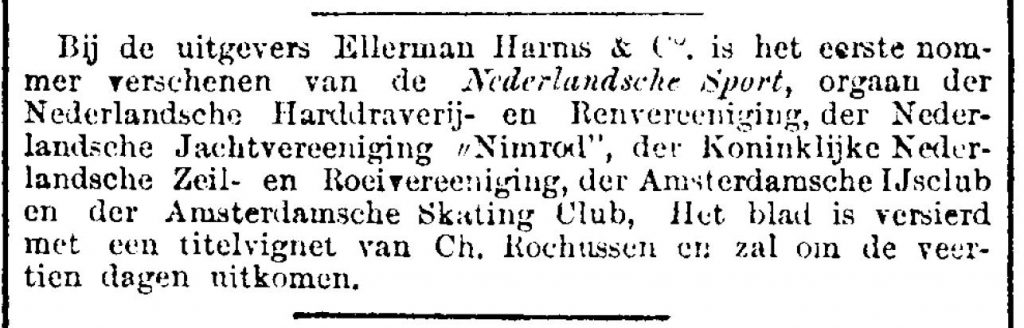 In 1884, the Dutch Cyclist Association established its own monthly publication, later called De Kampioen, and in 1889, Het Sportblad, was a publication linked to the Dutch Football and Athletic Association. Just as with Nederlandsche Sport, these periodicals were made by and for ‘insiders’, for those who were already connected to sport and their content reflected this. Although there were reports on the passage of matches, races and contests, a great deal of administrative detail was given out; the times and dates of meetings, fixtures, and minutes of associated clubs, associations or organisations. Such publications served an official function and were not primarily concerned with informing a wider public about sporting events. De Sportkroniek, first published in 1901 in The Hague, and De Sport of Rotterdam in 1905, were other publications which followed this form. Not all the periodicals were successful. By 1890, Het Sportblad had disappeared, despite its role of as an official association publication. (link)