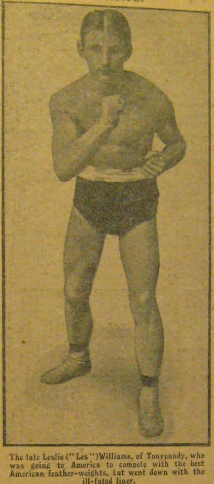 Amongst the dead were two young Welshmen from the Rhondda Valley, boxers David (Dai) Bowen from Treherbert and Leslie (Les) Williams from Tonypandy, who were en- route to further their careers in Pennsylvania and had originally booked to travel on the ‘Lusitania’, but switched to the Titanic for a later departure.