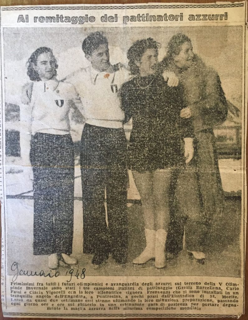 In the days before the competition, on 28th January 1948, Costanza was reported to be competing when Corriere d’Informazione winter sports journalist Ciro Verratti wrote: “in Ladies figure skating we are sure that thanks to Costanza Vigorelli Italy will make a good impression” and on page one of 30th January 1948 edition of Corriere dell’Informazione contains a photograph of Ciacia, with the caption – “Costanza Vigorelli, our best figure skating representative at the Olympic Games.”