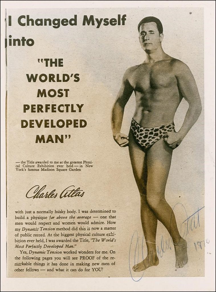 Atlas’s masculine posturing’s within his advertisements featured the Italian émigré in the hybrid loincloth posing trunk, which Atlas had worn in MacFadden’s shows.