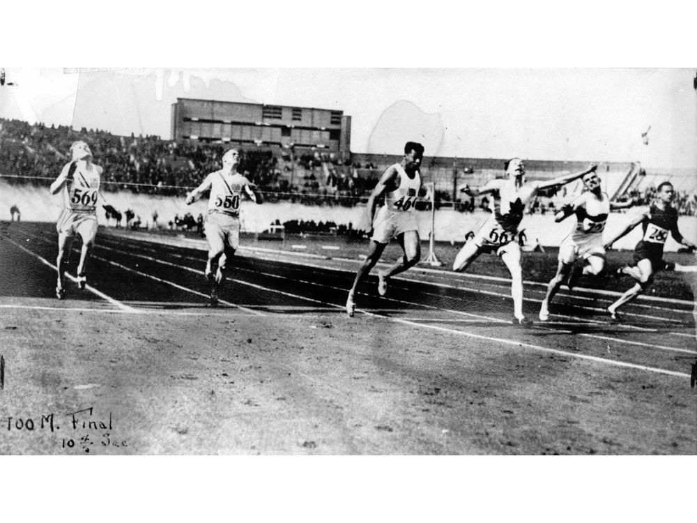 - Percy Williams at the finish of the 100m final of the 1928 Amsterdam Olympics.